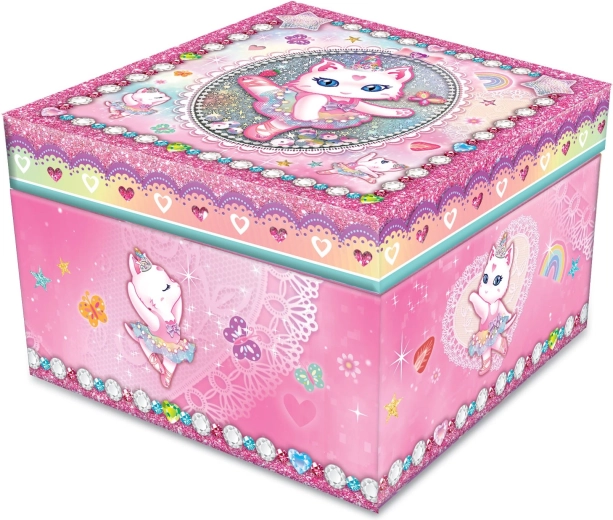 Stwórz w pokoju dziecka magiczną atmosferę. Po uniesieniu pokrywki, w blasku lusterka zaczyna obracać się baletnica-kotek, a przestrzeń wypełnia delikatna muzyka. Szkatułka ma praktyczne przegródki na drobne skarby i biżuterię, dzięki czemu wszystko pozostaje przejrzyście uporządkowane.