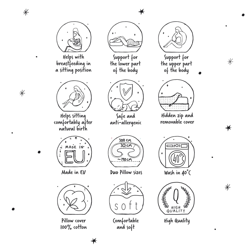 Cebuśka Duo została zaprojektowana dla wymagających mam, które szukają połączenia wygody, podparcia i elastyczności w ciąży oraz podczas karmienia. Dwuczęściowy system z różnymi wypełnieniami umożliwia dokładne dopasowanie – miękka część pod głowę z włókna pustego z wykończeniem silikonowym oraz główna, dłuższa część z mikrogranulek EPS, które dopasowują się do ciała i zapewniają stabilne wsparcie.