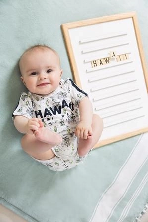Praktyczne zapięcie na napy w kroku ułatwia przewijanie, okrągły dekolt i krótkie nogawki zapewniają całodzienny komfort. Zabawne letnie motywy i napis HAWAII dodają stylizacji radosnego charakteru – perfekcyjne na każdy dzień.