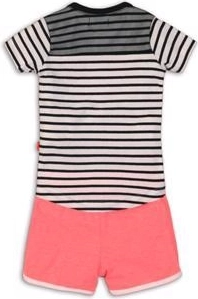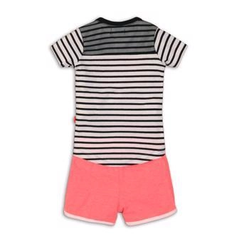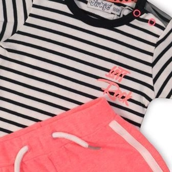 Ubranie Twojego dziecka w komfort i styl z zestawem DIRKJE, który łączy praktyczność i uroczy design. Pasiasta koszulka w kolorach biało‑czarnych z drobnym różowym motywem doskonale komponuje się z różowymi szortami z białą lamówką. Dzięki miękkiej bawełnie i domieszce elastanu ubranie świetnie się dopasowuje i nie ogranicza ruchów.
