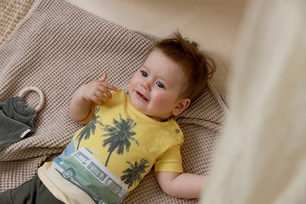 Ciesz się latem każdego dnia z lekką i przyjemną koszulką dla małych odkrywców. Żółty odcień i zabawny plażowy motyw nadają stylizacji świeży look, a miękki dżersej z domieszką elastanu gwarantuje swobodę ruchów i komfort przez cały dzień.