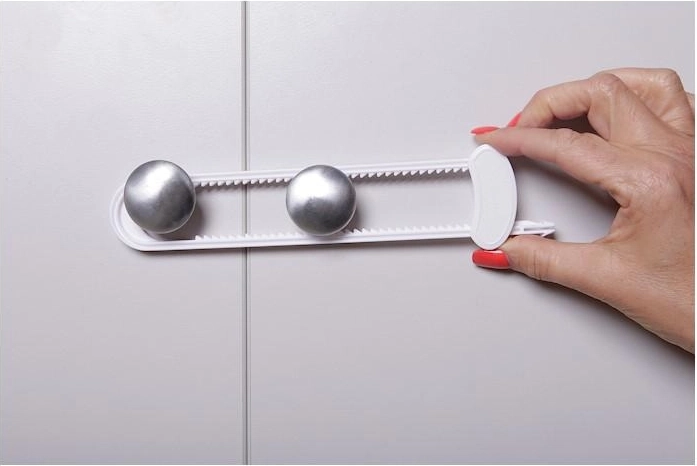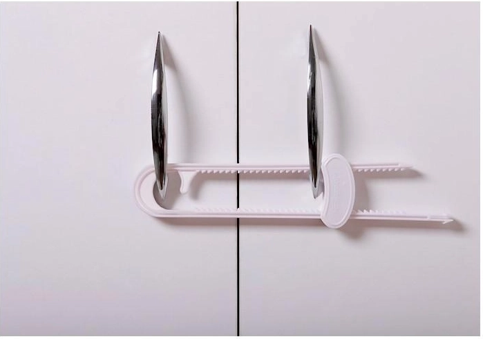 Zamek dopasowuje się do różnych rozstawów podwójnych uchwytów i okrągłych gałek, dzięki czemu świetnie działa w większości kuchennych i łazienkowych szafek.