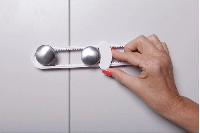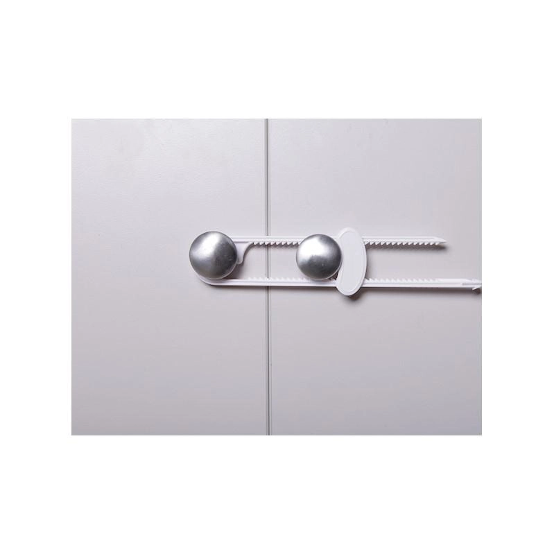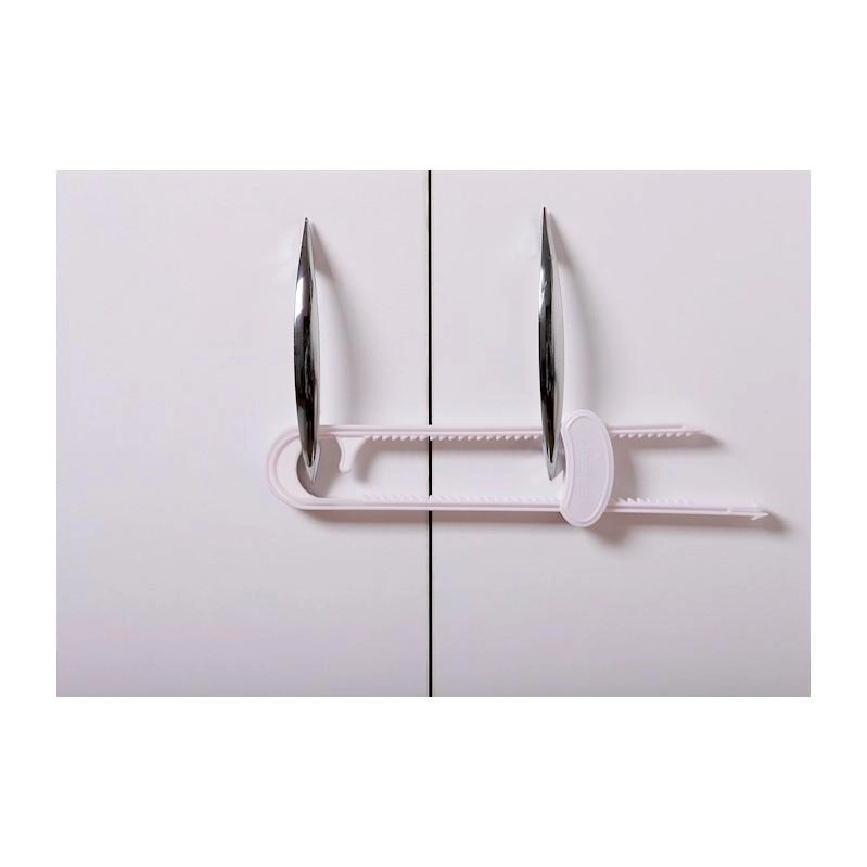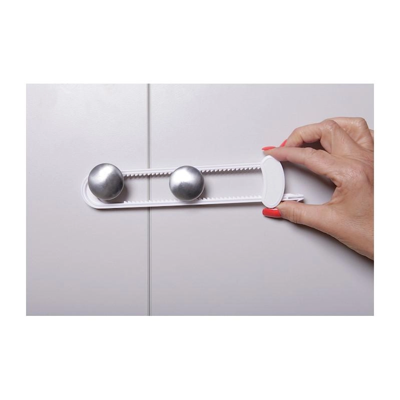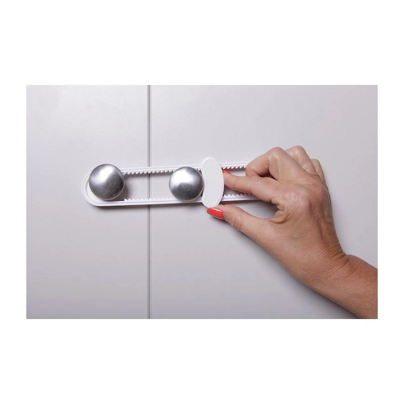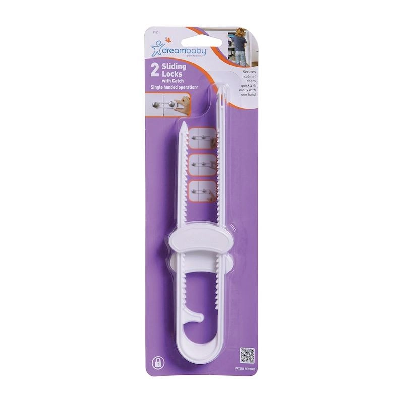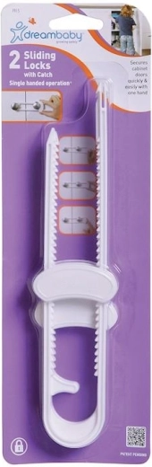 Przesuwane zamki Dreambaby to proste i skuteczne rozwiązanie, aby zabezpieczyć szafki przed ciekawskimi dziećmi. Dzięki mechanizmowi przesuwanemu zamek mocno nasuwa się na parę uchwytów lub uchwyty w kształcie litery D i zapobiega niechcianemu otwarciu.