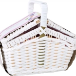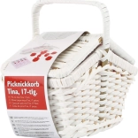 Biały wiklinowy kosz oferuje miejsce do przechowywania całego zestawu, a jego solidna konstrukcja i dekoracyjny element dodają autentycznego poczucia pikniku.