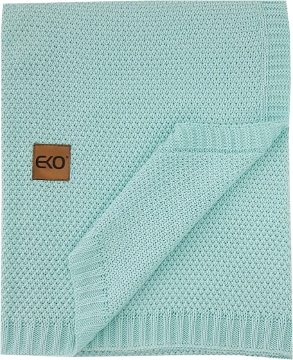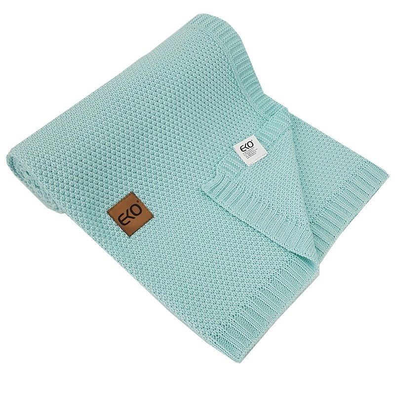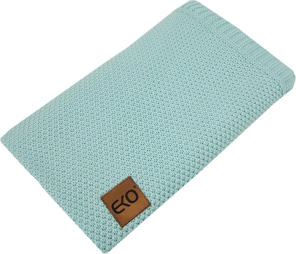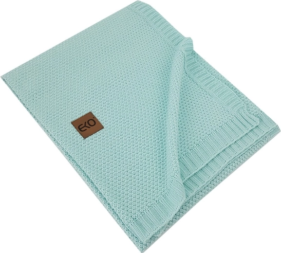 Nowoczesny, dziergany wzór z dyskretną metką EKO oraz rozmiar 100 × 80 cm do wózka, łóżeczka i w podróży.