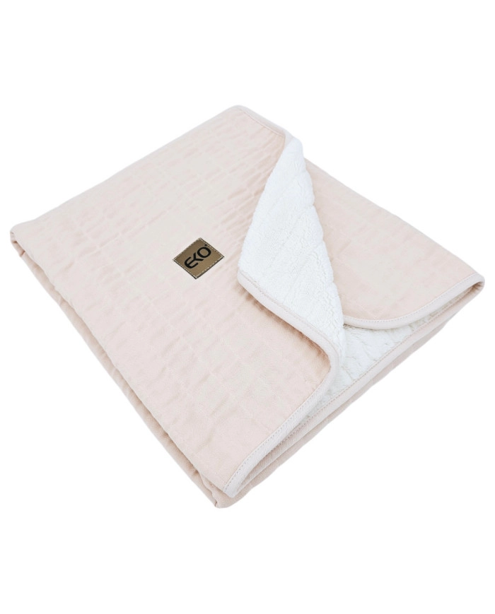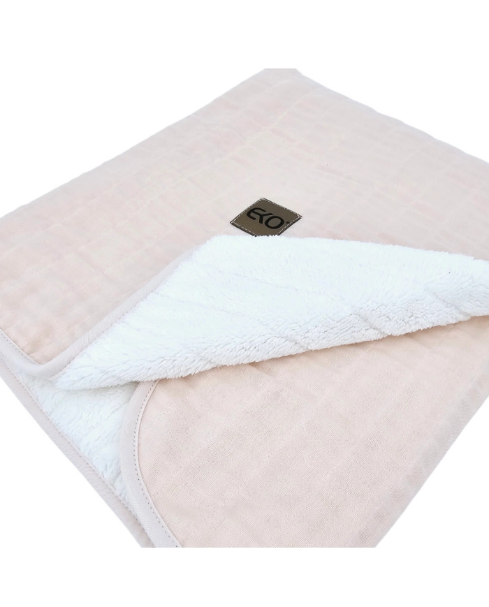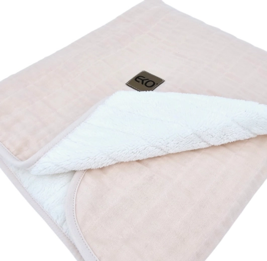Ten muślinowy kocyk EKO w delikatnym różowym odcieniu łączy naturalną 100% bawełnę po zewnętrznej stronie oraz ciepłą podszewkę z futerka (polar) ze 100% poliestru. Lekkie, a jednocześnie skuteczne ocieplenie z hipoalergicznego włókna zapewnia przyjemne ciepło bez zbędnego obciążenia. Kocyk z łatwością wykorzystasz przez cały rok – w domu, w podróży i na spacerach.