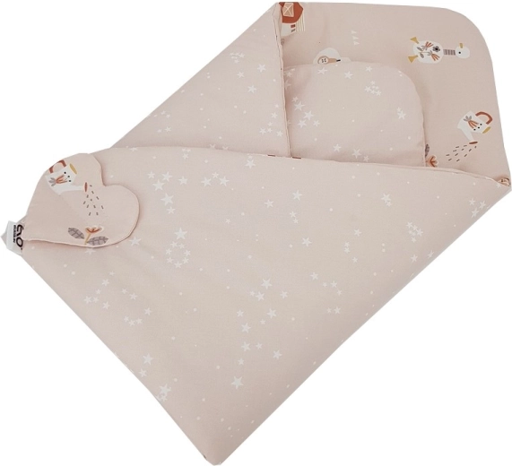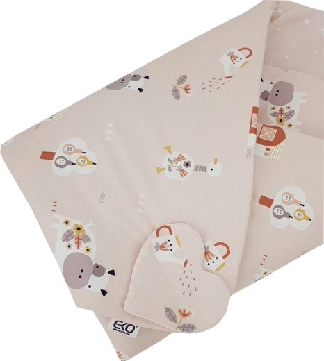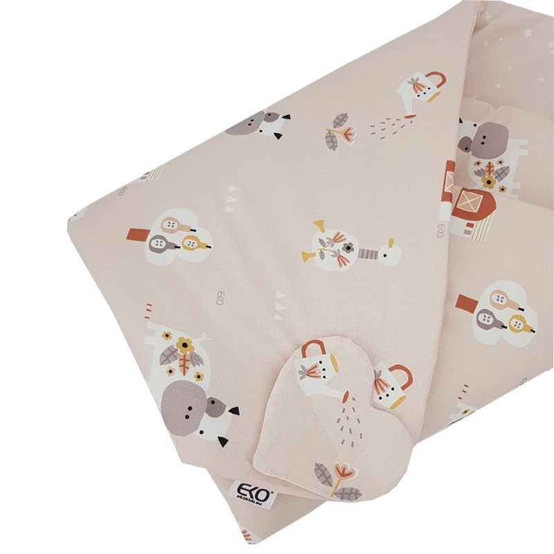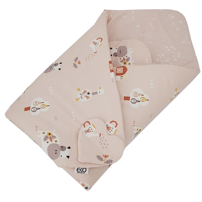 Rożek EKO My Farm w pudrowo różowym kolorze wykonany jest z przyjemnej w dotyku, bardzo delikatnej 100% bawełny z nadrukiem cyfrowym. Dwustronne wykonanie pozwala zmieniać wygląd zależnie od nastroju i łatwo dopasować go do wyprawki. Miękkie i oddychające hipoalergiczne wypełnienie zapewnia ciepło i komfort podczas snu i przytulania.