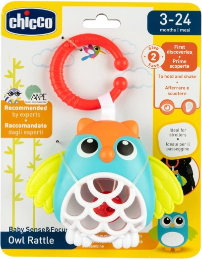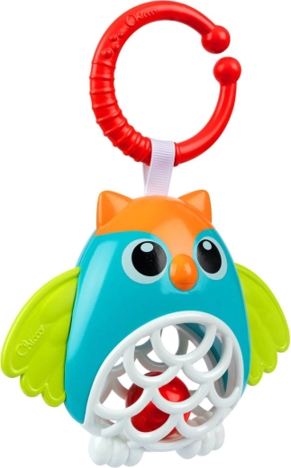 Sowa Chicco na pierścieniu C to kolorowa grzechocząca zabawka, która zainteresuje maluszka dźwiękiem, kształtami i kontrastowymi barwami. Miękkie elementy są delikatne dla dziąseł, a rączka i korpus zabawki łatwe do trzymania. Dzięki uniwersalnemu pierścieniowi szybko przymocujesz ją do wózka, fotelika samochodowego lub łóżeczka.