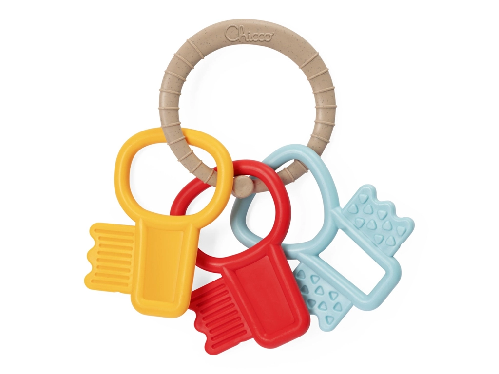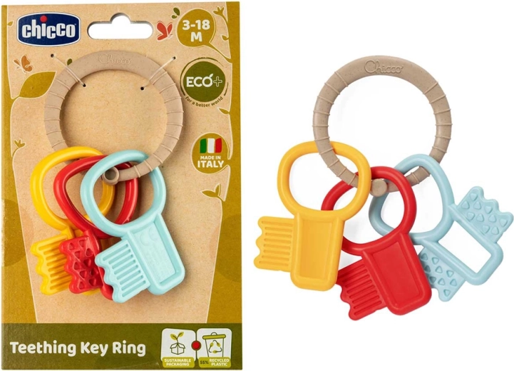 Gryzak CHICCO Eco+ Klucze łączy zrównoważone materiały z przemyślanym designem dla codziennego komfortu Twojego maluszka. Trzy kluczyki z różnymi wkładkami i powierzchniami delikatnie masują dziąsła, a jednocześnie grzechoczą, stymulując słuch i wzrok. Dzięki ergonomicznemu kształtowi i fakturowanemu pierścieniowi chwytanie jest łatwe nawet dla małych dziecięcych dłoni.