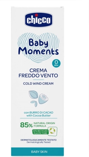 Delikatny ochronny krem CHICCO Baby Moments chroni wrażliwą skórę dziecka przed zimnem i wiatrem. Jego formuła z 81% składników pochodzenia naturalnego, masłem kakaowym i shea, pantenolem oraz olejami Omega-3 wzmacnia barierę skórną i pozostawia skórę miękką oraz odżywioną. Bez parabenów, barwników i alkoholu, z delikatnym zapachem Baby Moments. Przebadany dermatologicznie i okulistycznie, odpowiedni od urodzenia.