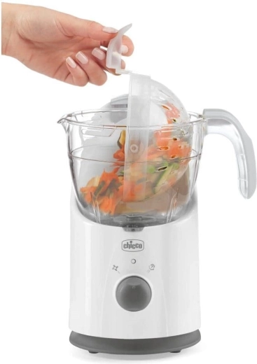CHICCO Easy Meal to idealny pomocnik do codziennego przygotowywania świeżych posiłków dla dzieci. Unikalna konstrukcja miski zapewnia szybkie i równomierne parowanie przy maksymalnym zachowaniu witamin i smaku. Dzięki systemowi przechylania z łatwością opróżnisz ugotowaną zawartość bezpośrednio do miksera jedną ręką i w minutę podasz posiłek.