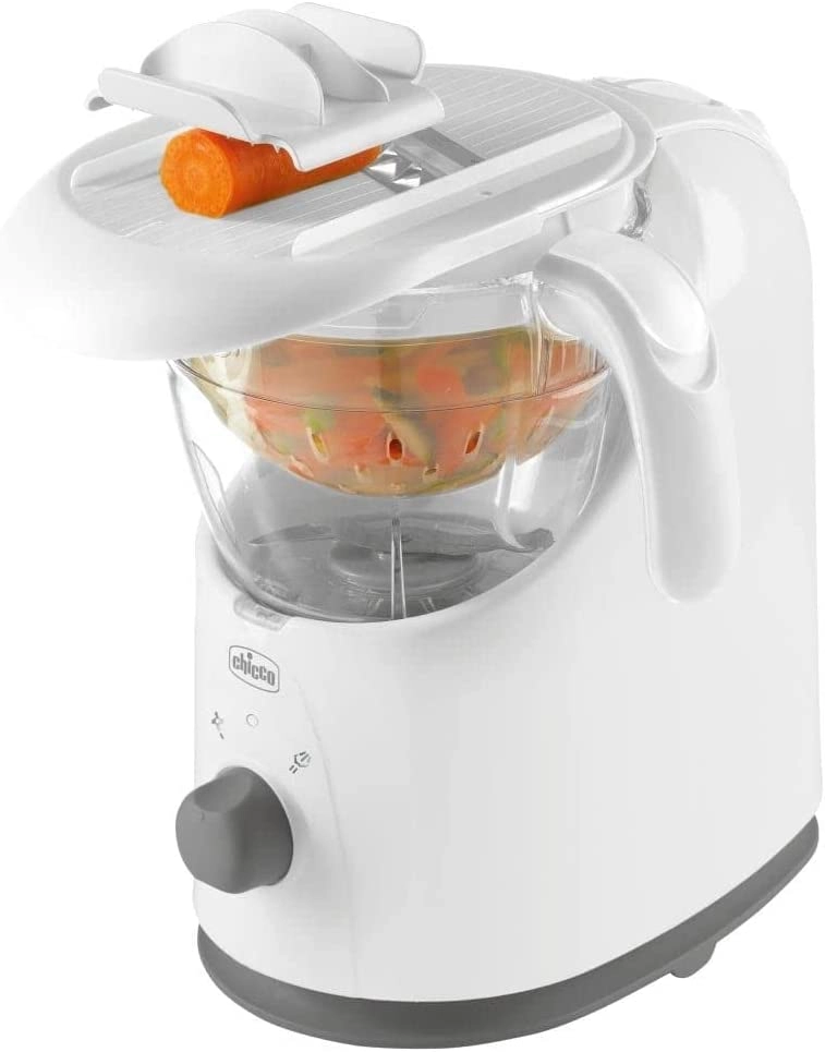 Rozpocznij od tarcia owoców i warzyw bezpośrednio do misy – bez noży i deski. Po ugotowaniu na parze wystarczy przełączyć na miksowanie, a nierdzewne noże wyczarują gładkie purée o idealnej konsystencji. Resztki możesz przechować w pojemnikach na żywność CHICCO Easy Meal i później łatwo podgrzać.