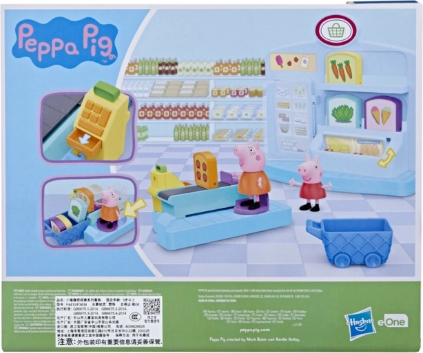 Ciesz się zakupami z Peppą! Zestaw supermarketu oferuje dzieciom mnóstwo interaktywnej zabawy: ruchomy pas przy kasie, otwieraną szufladę, obrotowe karty towarów, lodówkę oraz 2 figurki (Peppa i mama). Ustaw figurkę na aktywnym punkcie i zobacz, jak produkty zsuwają się do wózka.