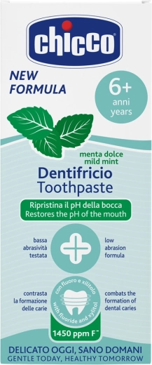 Pasta do zębów Chicco Delikatna mięta zapewnia łagodną i skuteczną pielęgnację uzębienia dzieci po wyrznięciu się zębów stałych. Nieabrazyjna formuła szanuje wrażliwe szkliwo i minimalizuje ryzyko jego uszkodzenia. Połączenie betainy i witaminy E pomaga chronić i koić dziąsła, a fluorek wspiera odporność szkliwa na próchnicę.