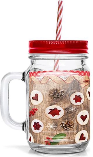 Stylowa szklanka z uchem i metalową zakrętką z uszczelką do beztroskiego popijania w domu i w ogrodzie. Oferuje pojemność 450 ml, ma praktyczne ucho oraz oryginalny świąteczny motyw ciasteczek linieckich, który ucieszy w adwencie i przez cały rok. Dzięki zakrętce napój nie przyciąga owadów i przy przewróceniu nie wylewa się.