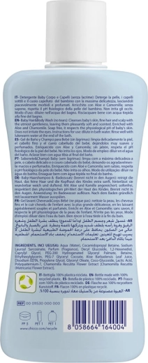 Delikatny żel pod prysznic i szampon 2w1 dla niemowląt od urodzenia łagodnie myje ciało i włoski w jednym kroku. Zawiera aloes dla nawilżenia i ukojenia oraz rumianek dla zmiękczenia. Łatwo się spłukuje, nie wysusza wrażliwej skóry, pozostawia ją miękką i pachnącą, a włoski łatwe do rozczesania. Opracowany i testowany przez pediatrów i dermatologów, wyprodukowany we Włoszech.