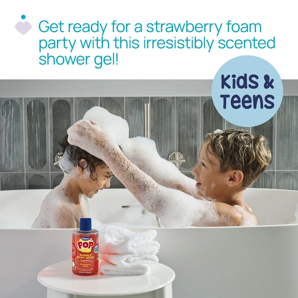 Chicco POP Strawberry Candy zamienia każde prysznicowanie w pachnący rytuał pełen radości. Lekka, bogato pieniąca się konsystencja delikatnie oczyszcza i pozostawia skórę miękką oraz świeżo otuloną słodkim truskawkowym zapachem, który pokochają zarówno dzieci, jak i nastolatkowie.