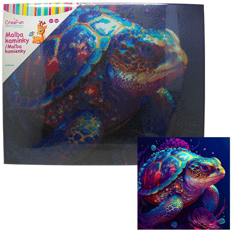 Obraz nocnego żółwia wyróżnia się żywymi kolorami i efektownym blaskiem, który powstaje dzięki nakładaniu drobnych kamyczków na wstępnie nadrukowane, samoprzylepne płótno z pełnym oznaczeniem pól. Dzięki wysokiej jakości materiałom i drewnianej ramie gotowe dzieło jest przygotowane do ekspozycji i długotrwałego zachowania.