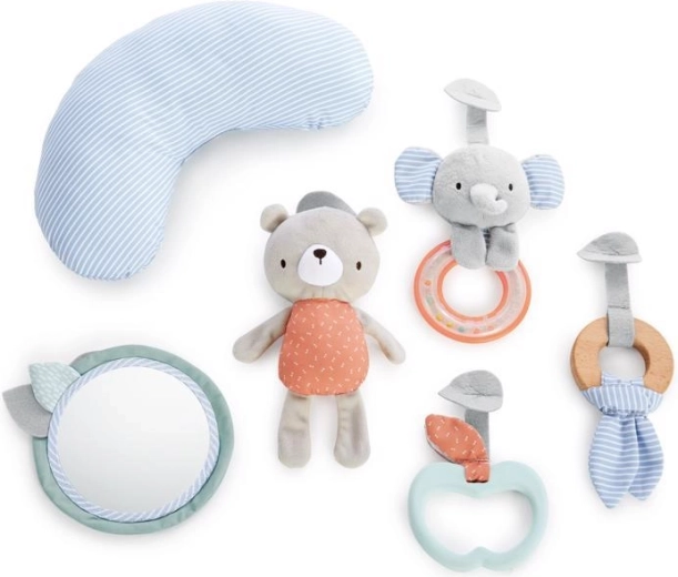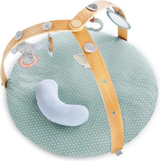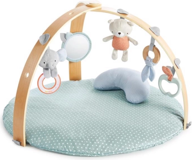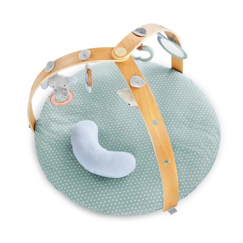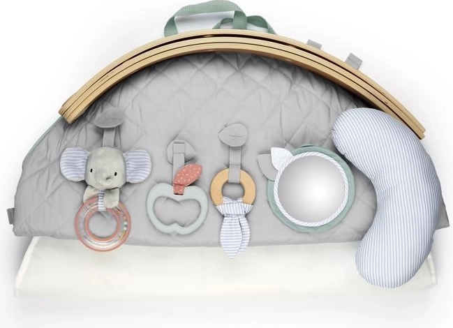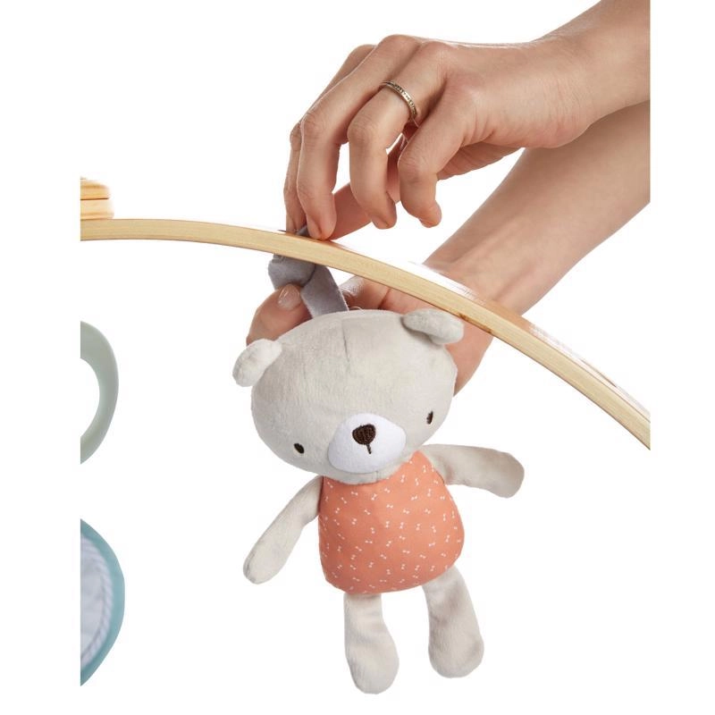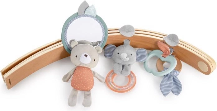 Dwa skrzyżowane pałąki w stylu drewnianym z miękkimi zwierzątkami, gryzakami i bezpiecznym lusterkiem stymulują wzrok, dotyk oraz pierwsze chwyty.