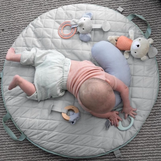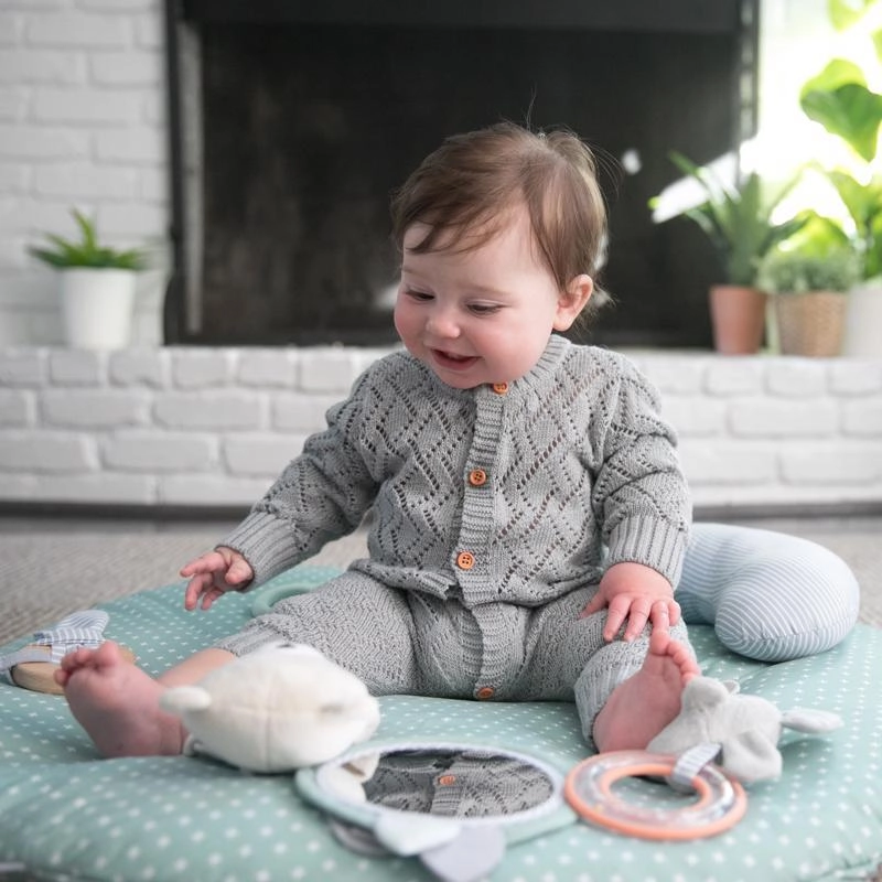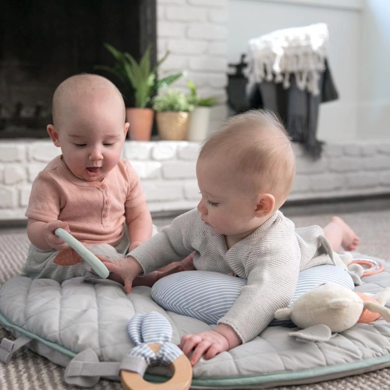 Mata do zabawy Loamy zamieni każdy kąt domu w przytulne i stylowe miejsce do zabawy już od narodzin. Miękka, dwustronna mata z delikatnym wzorem oraz dwa skrzyżowane pałąki o naturalnym, drewnianym wyglądzie przyciągają uwagę, a zawieszane zabawki, gryzak i bezpieczne lusterko zachęcają maluszka do sięgania, chwytania i odkrywania własnego odbicia.
