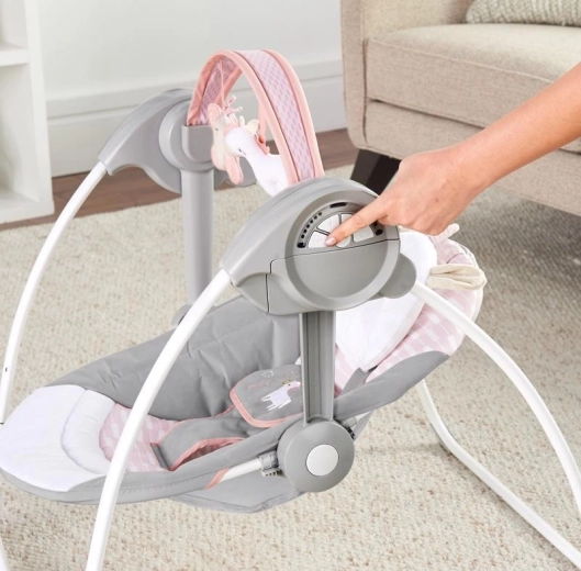 Ingenuity Flora the Unicorn to lekka i bardzo kompaktowa huśtawka, która oszczędza miejsce, ale nie funkcje. Dzięki technologii ComfortRecline łatwo ustawisz całe siedzisko w dwóch wygodnych pozycjach, a WhisperQuiet zapewnia bardzo cichą pracę dla niezakłóconego kołysania i odpoczynku.