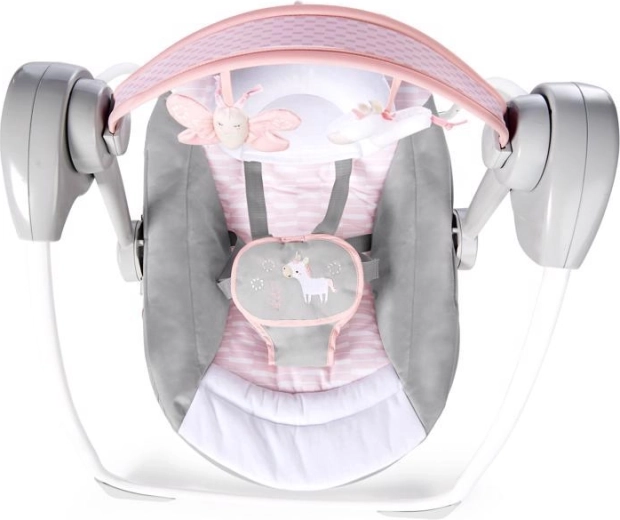 Ukoisz i zabawisz swoje dziecko w każdej chwili i w każdym miejscu dzięki kompaktowej huśtawce dziecięcej Ingenuity Flora the Unicorn. Oferuje 2 pozycje siedziska, 12 melodii z regulacją głośności, cichy tryb WhisperQuiet oraz timer 30/45/60 min. Odłączany pałąk z 2 pluszowymi zabawkami, miękkie, nadające się do prania pokrycia i 5‑punktowe pasy zapewniają wygodę i bezpieczeństwo od urodzenia do 9 kg.