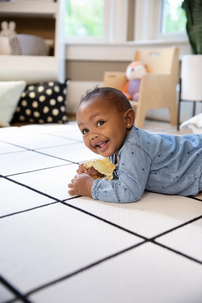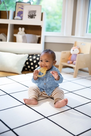 Ergonomiczny pierścień został zaprojektowany z myślą o małych dziecięcych rączkach, aby maluszek mógł bezpiecznie trzymać gryzak i samodzielnie się wyciszać.