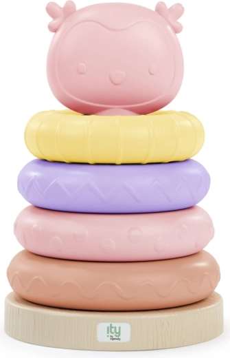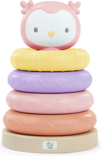 Wytrzymała podstawa z wyglądem drewna utrzymuje piramidę stabilnie podczas zabawy, a sówka na szczycie motywuje dzieci do ukończenia budowli.