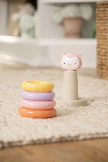 Stabilna podstawa w designie sztucznego drewna nadaje zabawce elegancki wygląd i zapewnia pewne ustawienie podczas zabawy. Pastelowe kolory i przyjazna sówka motywują dzieci do próbowania, sortowania i powtarzania, co wspiera koncentrację oraz pierwsze myślenie logiczne.