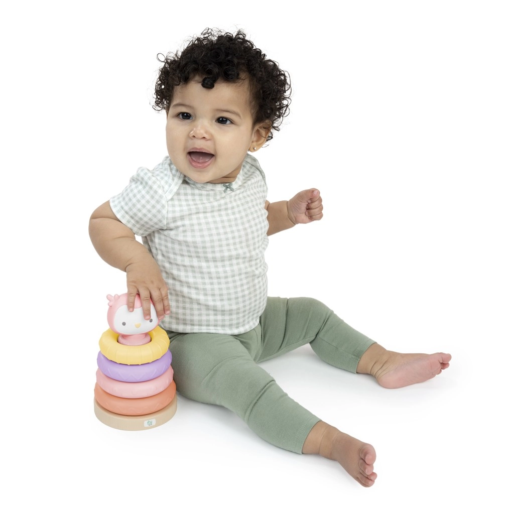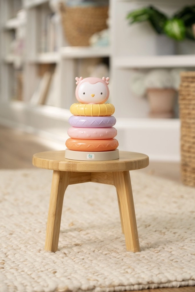 Składana piramida ity by INGENUITY z sówką Nally to idealna pierwsza zabawka edukacyjna, która zapewnia dzieciom bezpieczne odkrywanie kolorów, kształtów i faktur. Dzięki lekkim, teksturowanym kółkom bez BPA maluch łatwo je trzyma i układa, tym samym naturalnie trenując chwyt i koordynację.