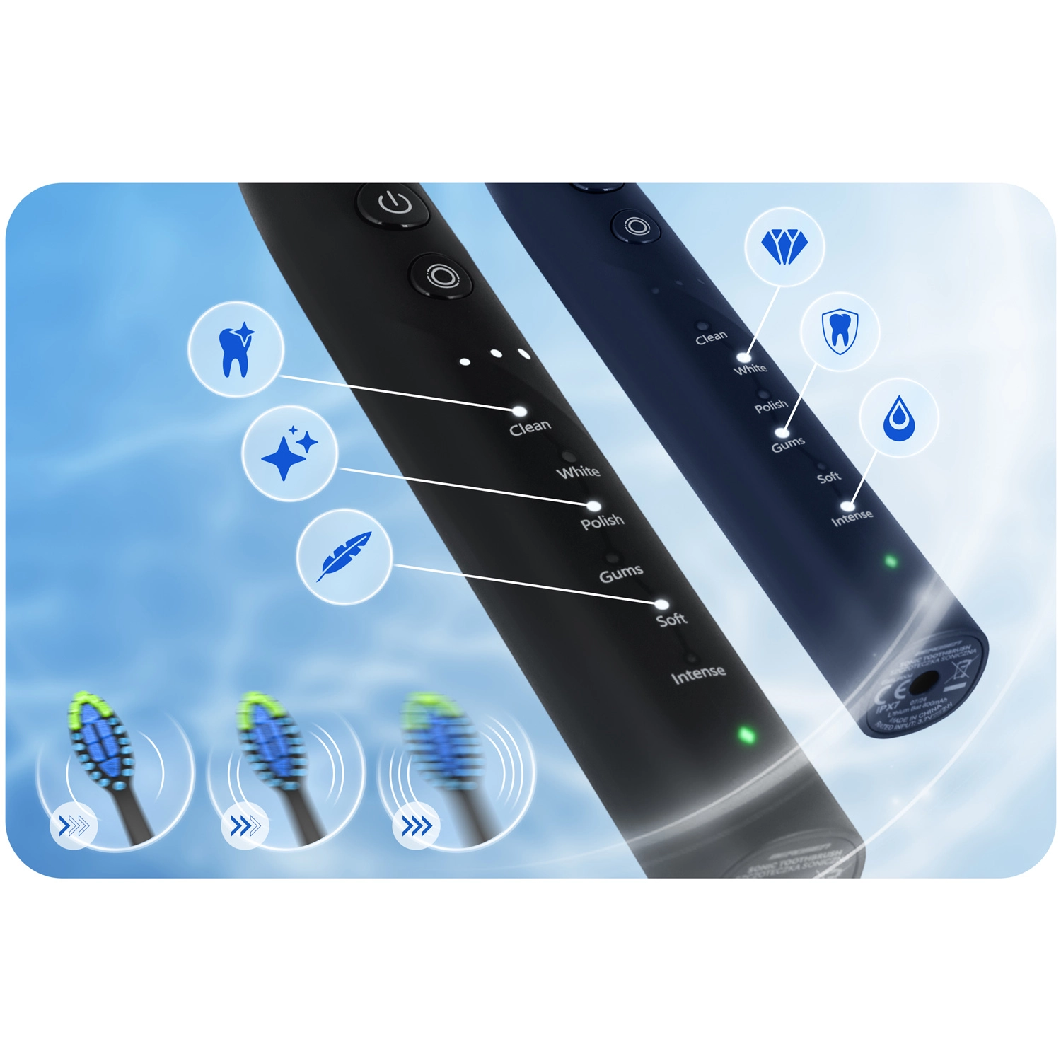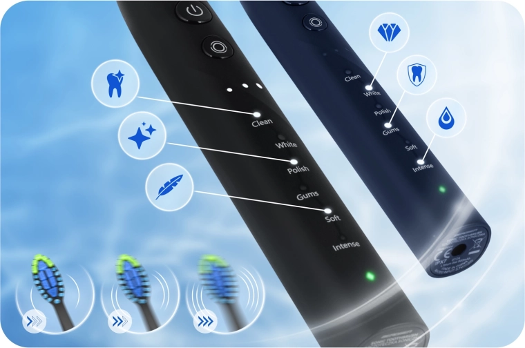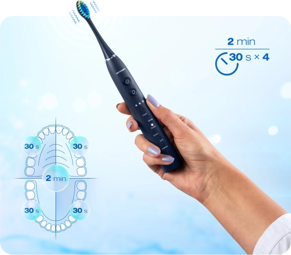18 kombinacji czyszczenia dla Twoich potrzeb: 6 trybów (CLEAN, WHITE, POLISH, GUMS, SOFT, INTENSE) oraz 3 poziomy intensywności. Od delikatnej pielęgnacji dla wrażliwych zębów po intensywne, głębokie czyszczenie – z łatwością wybierzesz odpowiednią opcję. Automatyczne wyłączenie po 2 minutach i 30‑sekundowe interwały ułatwiają podział jamy ustnej na cztery kwadranty dla równomiernych rezultatów.