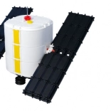 Konstrukcja satelity zawiera panele słoneczne, które ilustrują pozyskiwanie energii na orbicie.