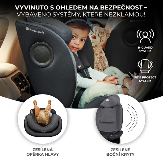 Za bezpieczeństwo odpowiada H-GUARD – trójwarstwowy zagłówek z pianką memory, oraz SPS+ – wzmocniona ochrona boczna przed uderzeniami. Dla wygody przewidziano 12 stopni regulacji zagłówka, 5 pozycji odchylenia (RWF i FWF) oraz wkładkę z pianki memory dla mniejszych dzieci. Pokrowiec łatwo zdjąć i wyprać.