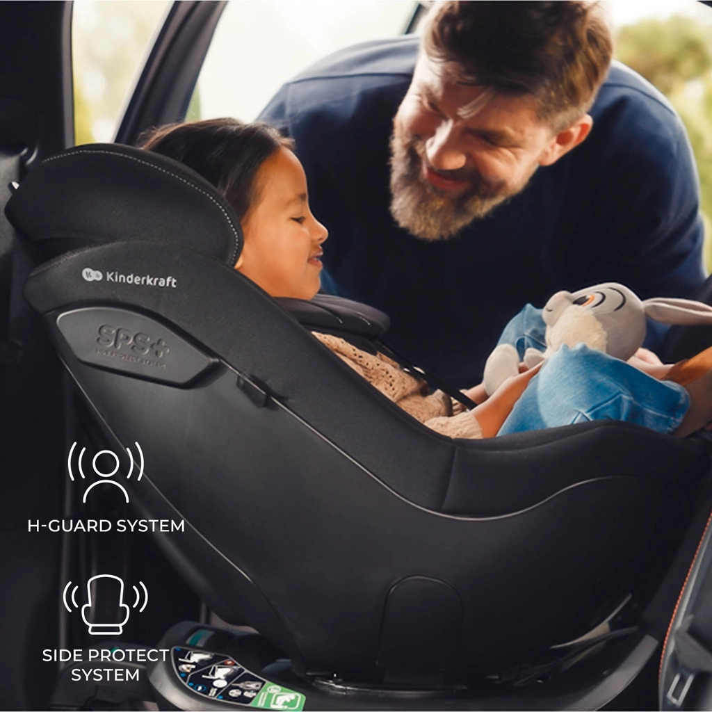 Fotelik KINDERKRAFT I-Guard Pro i-Size łączy najwyższy poziom ochrony z intuicyjną obsługą. Dzięki obrotowej bazie 360° łatwo przełączysz między tyłem do kierunku jazdy (RWF) a przodem do kierunku jazdy (FWF) i zapniesz dziecko bez zbędnego obciążania pleców. ISOFIX, noga podpierająca oraz 4 wskaźniki prawidłowego montażu gwarantują spokój podczas każdej podróży.