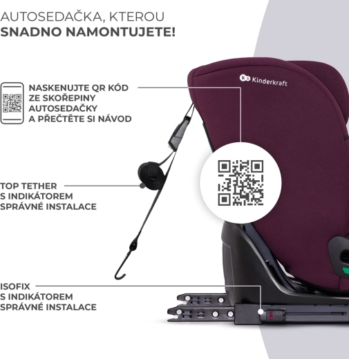 Złącza ISOFIX i górny pas TOP TETHER z wskaźnikami prawidłowego montażu gwarantują szybkie zainstalowanie i stabilność fotelika w samochodzie.