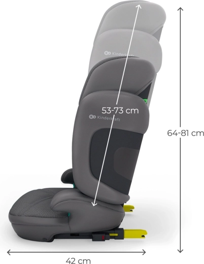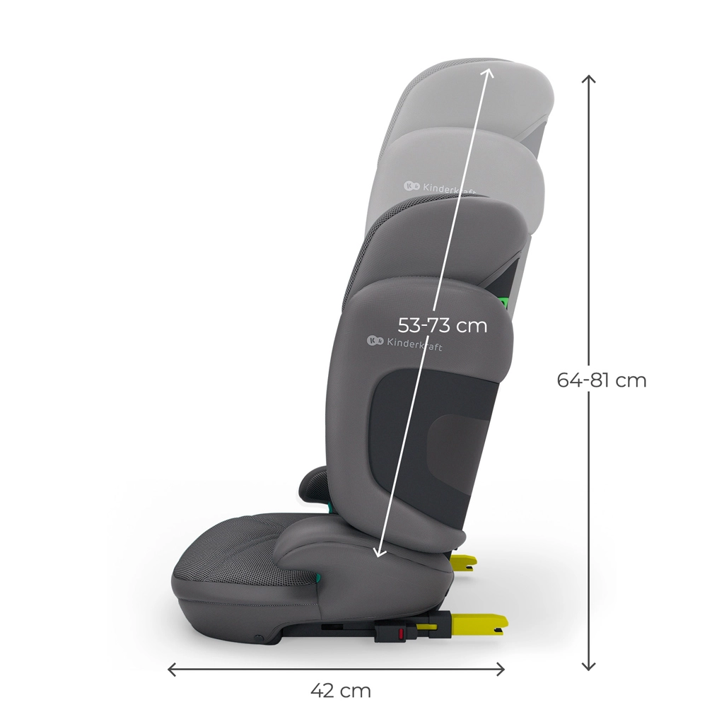 Jednoczesna regulacja wysokości zagłówka i szerokości oparcia zapewnia idealne dopasowanie do sylwetki dziecka od 100 do 150 cm.