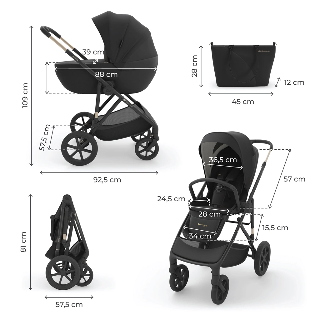 - Głęboka gondola, siedzisko spacerowe, rama z kołami, torba dla rodziców, kosz na zakupy
