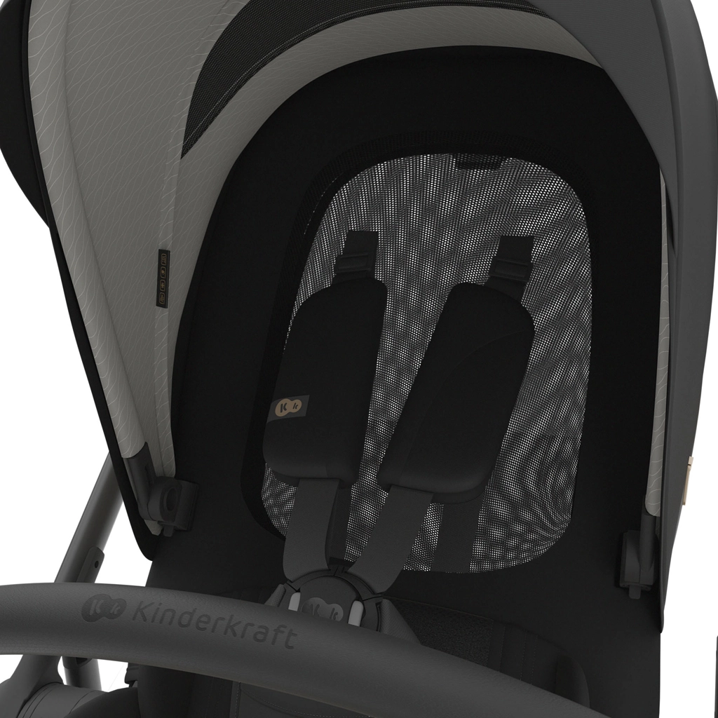 Siedzisko spacerowe z letnim panelem mesh poprawia cyrkulację powietrza w upalne dni. Dziecko chronią wyściełane, 5‑punktowe pasy oraz odpinana barierka.
