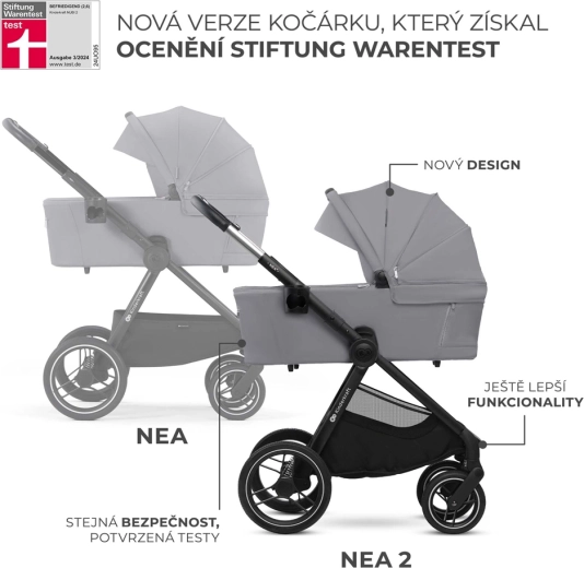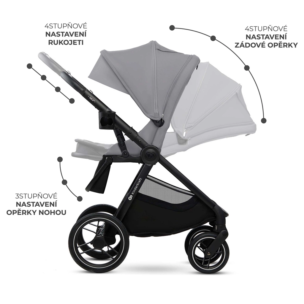 KINDERKRAFT NEA 2 2w1 to przemyślany wózek do miasta i poza nim. Duże, wytrzymałe koła z amortyzacją radzą sobie z krawężnikami i nierównymi drogami, a lekka konstrukcja i teleskopowa rączka zapewniają wygodne manewrowanie. Gondola z miękkim materacem jest idealna od urodzenia, a siedzisko spacerowe rośnie z dzieckiem aż do 22 kg. Budka z ochroną UPF50+, wodoodpornym materiałem, panelem wentylacyjnym i okienkiem chroni i umila każdy spacer.