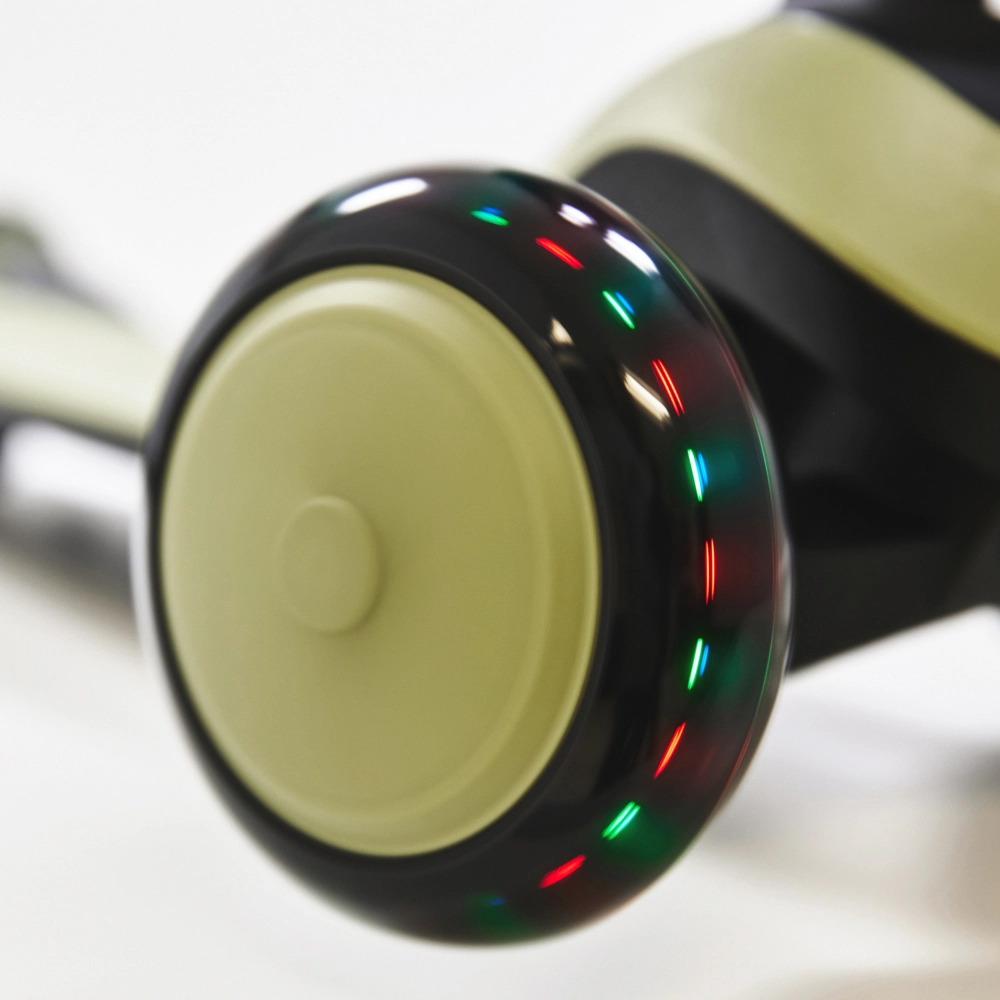Duże przednie koła PU z diodami LED zapalają się podczas jazdy. Zwiększają widoczność o zmierzchu i nadają jeździe efektowny wygląd bez baterii.