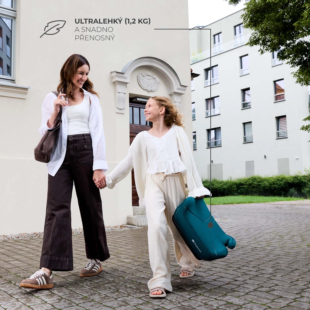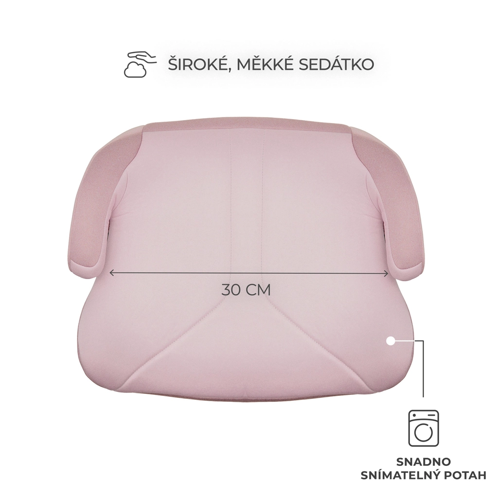 Siedzisko jest ultralekkie (1,2 kg), więc łatwo je przenosić między samochodami. Montaż jest intuicyjny przy użyciu 3‑punktowego pasa bezpieczeństwa, natomiast szerokie i miękkie siedzisko z wysokiej jakości pianki dba o komfort także podczas dłuższych tras. Ergonomiczne prowadnice/uchwyty pomagają prowadzić pas na właściwej wysokości, a zdejmowany pokrowiec można prać w pralce.