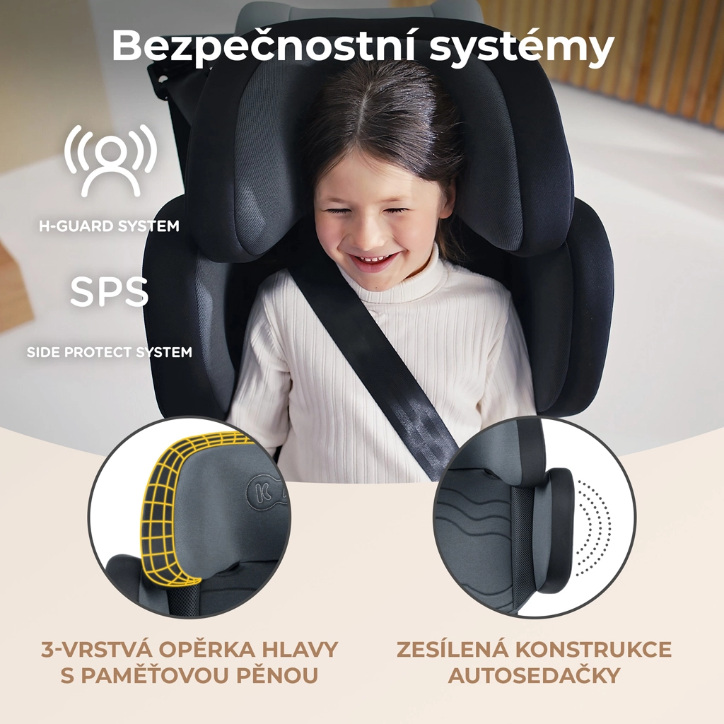 Zagłówek z technologią H-Guard ma trzy warstwy, w tym piankę memory dla lepszego pochłaniania energii, oraz aż 15 płynnych pozycji regulacji jedną ręką. Szerokie osłony boczne chronią głowę i ramiona, a wentylowane elementy tapicerki z siatki dbają o przyjemny klimat. Fotelik można regulować na wysokość i szerokość, a dla oszczędności miejsca łatwo go złożyć i przechować.
