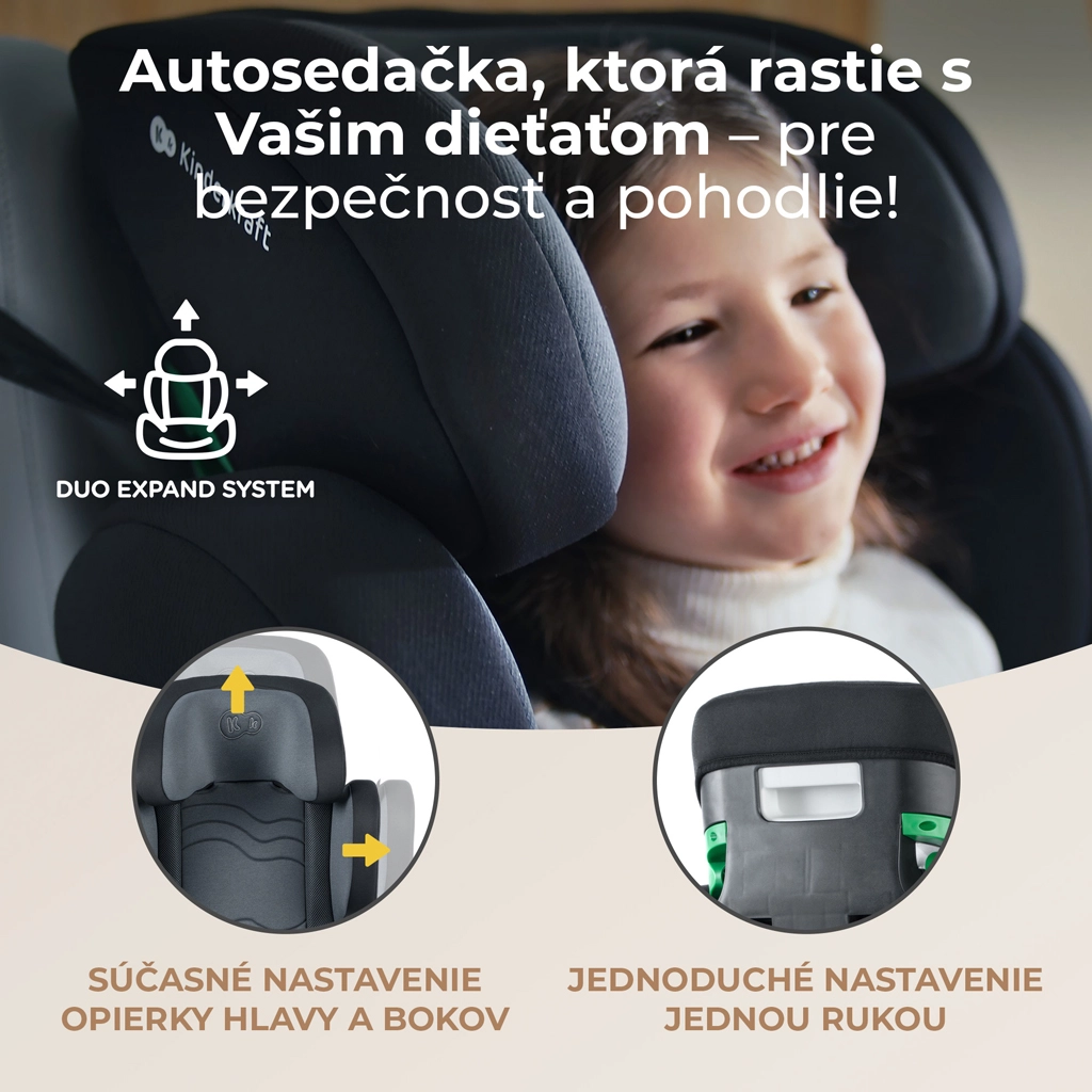 Kinderkraft XPAND 2 i-Size zapewnia wyższy poziom bezpieczeństwa i komfortu w codziennych podróżach dzieci o wzroście 100–150 cm. Konstrukcja spełnia najnowszą normę R129/03 i-Size i przeszła testy w renomowanych europejskich laboratoriach. Dzięki złączom ISOFIX oraz czytelnemu prowadzeniu pasa z zielonym wskaźnikiem montaż jest szybki i intuicyjny.