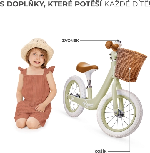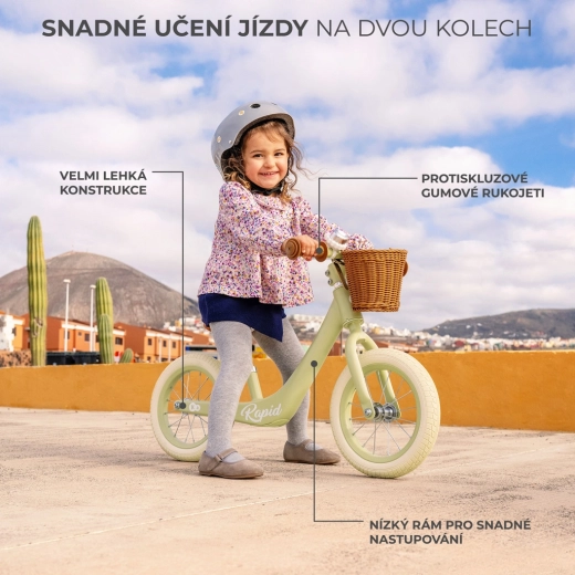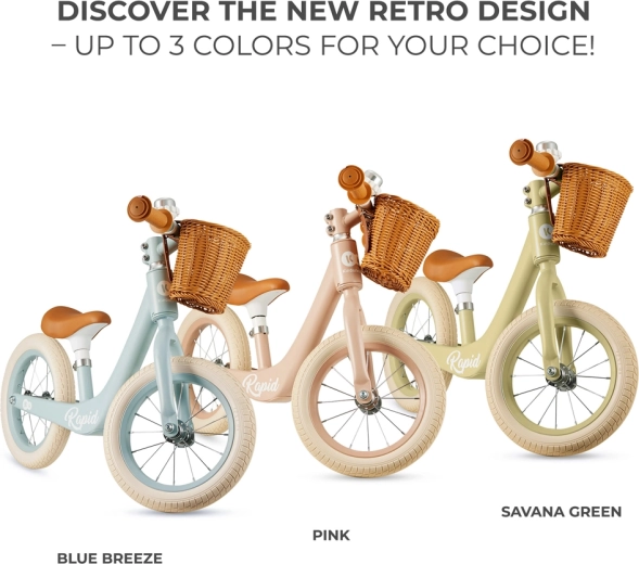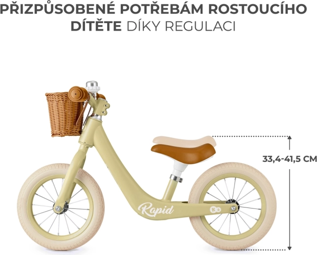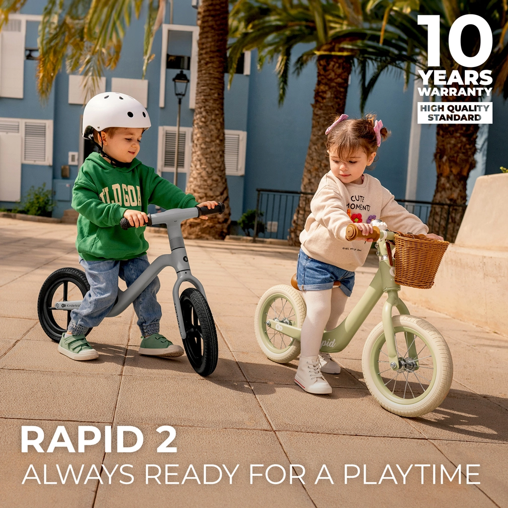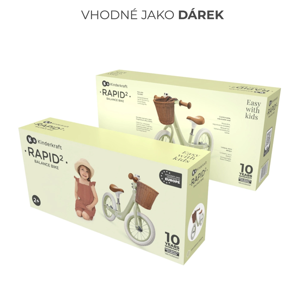 Odkryj radość z pierwszych przejażdżek z rowerkiem biegowym KINDERKRAFT RAPID 2 Savannah Green. Retro wygląd z praktycznym koszykiem zachwyca od pierwszego wejrzenia, a przemyślana konstrukcja wspiera rozwój równowagi i motoryki. Dzięki lekkiej ramie ze stopu magnezu (magnezja) rowerek waży ok. 3,7 kg, łatwo się go przenosi i jest wyjątkowo trwały.