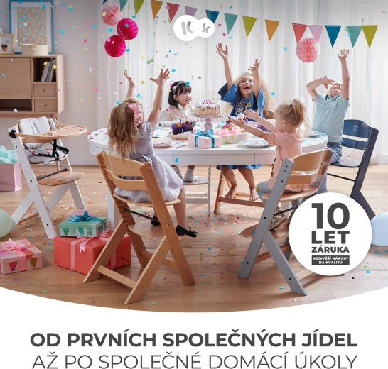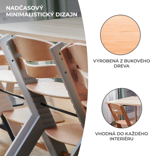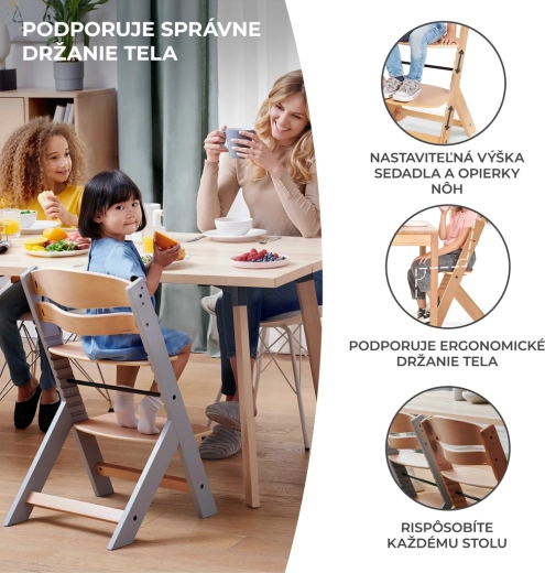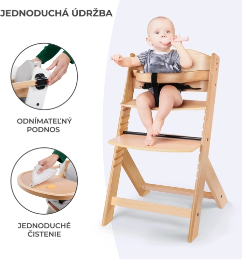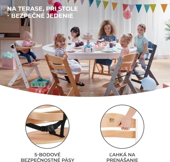 Dla najmłodszych dostępny jest szeroki, odpinany blat oraz trzypunktowe pasy, a dla starszych dzieci barierka zabezpieczająca. Krzesełko łatwo się czyści, a jego lekka konstrukcja umożliwia wygodne przenoszenie między kuchnią, jadalnią i tarasem. Minimalistyczny design świetnie wpasuje się w skandynawskie, klasyczne i nowoczesne wnętrza.