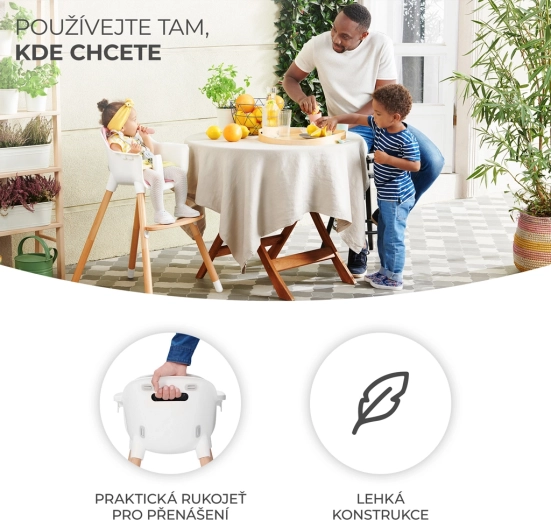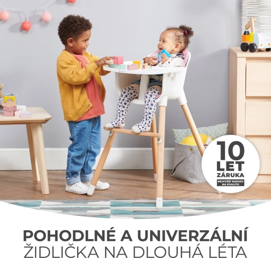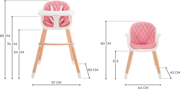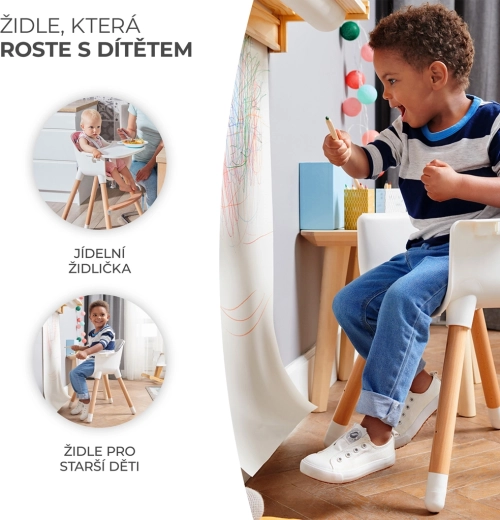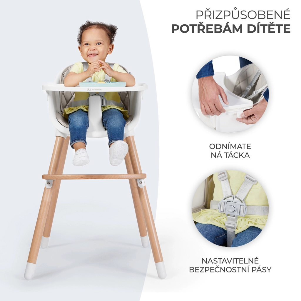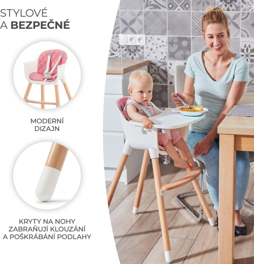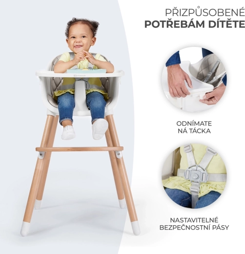 Praktyczne i stylowe krzesełko do karmienia 2w1, które rośnie wraz z Twoim dzieckiem – wysokie krzesełko do karmienia oraz niższe krzesełko dla starszych dzieci (do 20 kg). Łatwe w czyszczeniu dzięki zdejmowanemu blatowi i plastikowemu siedzisku, oferuje wygodny podnóżek, a bezpieczeństwo zapewniają 5‑punktowe pasy oraz antypoślizgowe końcówki na nogach.