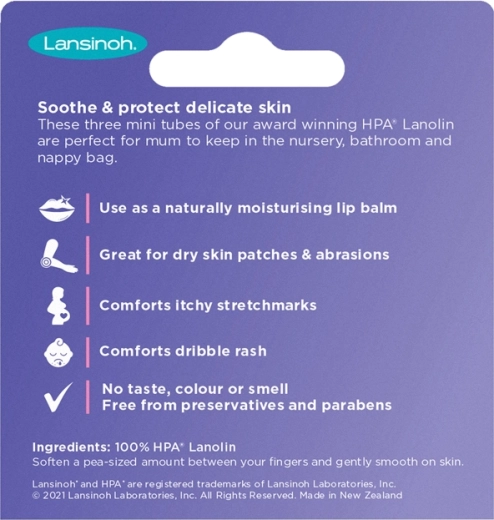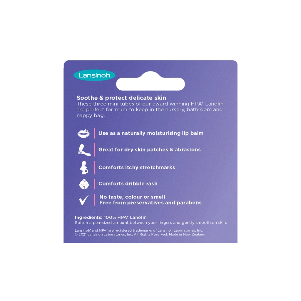 Lansinoh HPA krem z lanoliną Minis oferuje sprawdzoną pielęgnację brodawek karmiących mam w praktycznych tubkach 3×7 ml. Zapewnia natychmiastową ulgę, wspiera wilgotne gojenie ran bez powstawania strupów i chroni skórę przed dalszym podrażnieniem. Jest w 100% naturalny, hipoalergiczny i zatwierdzony przez Brytyjską Fundację ds. Alergii, dzięki czemu jest bezpieczny dla mamy i dziecka.