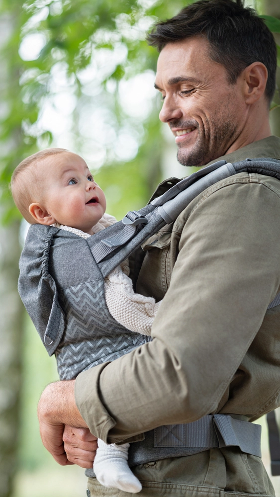 W pełni regulowany panel rośnie wraz z dzieckiem i dopasowuje się do jego sylwetki. Wyściełane pasy naramienne oraz szeroki pas lędźwiowy równomiernie rozkładają ciężar, co znacząco zmniejsza obciążenie pleców i ramion. Praktyczne detale, takie jak bawełniane osłonki na pasach chroniące skórę przed otarciami, podparcie głowy i kaptur dla spokojnego snu lub ochrony przed wiatrem, zwiększają komfort noszenia przez cały dzień.