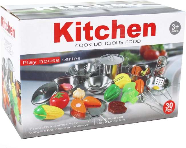W opakowaniu znajdziesz 30 wysokiej jakości elementów – różne garnki, patelnie i akcesoria kuchenne – zaprojektowane tak, aby odpowiadały prawdziwym naczyniom. Zestaw jest idealny do wspólnej zabawy rodzeństwa i przyjaciół, a także świetnie pasuje do pokoju dziecięcego.