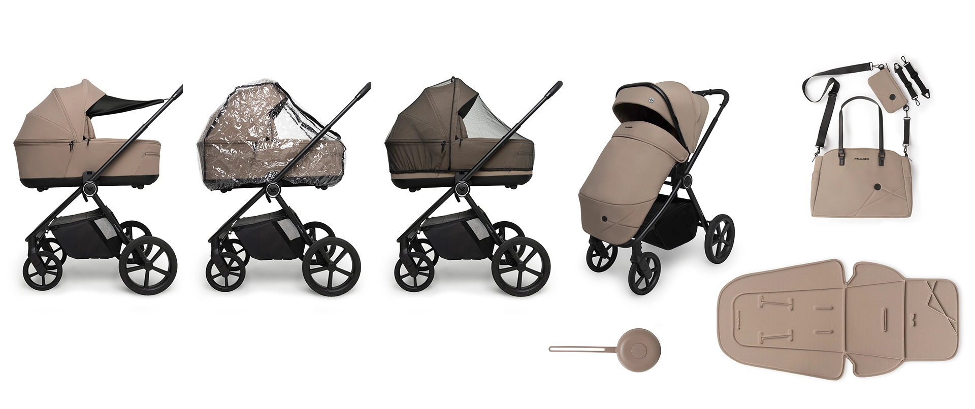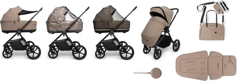 - moskitiera, osłona przeciwsłoneczna do gondoli, folia przeciwdeszczowa, osłona na nóżki do spacerówki, torba z odpinanym etui na telefon, wkładka z pianki memory, etui na smoczek